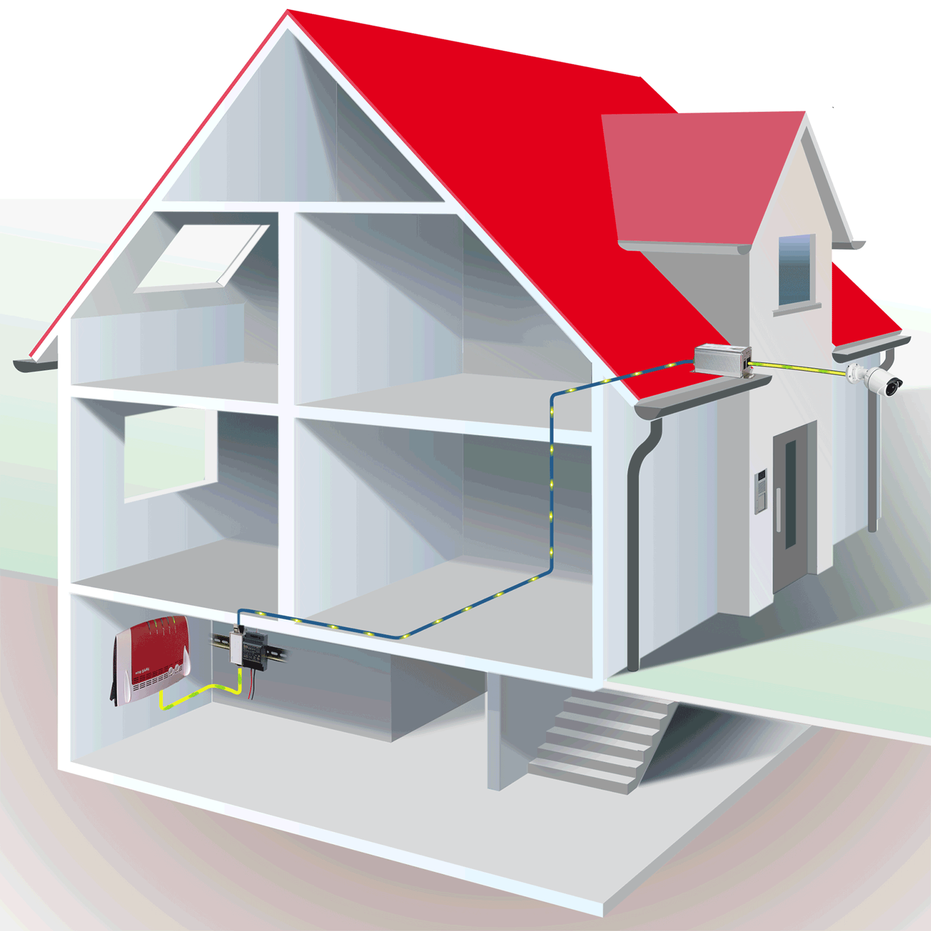 Einsatz mit einer IP VIdeoklingel. Ohne aufwendig LAN Kabel zur Türe zu führen, werden die existierenden Adern benutzt und mit der FRITZ!Box verbunden