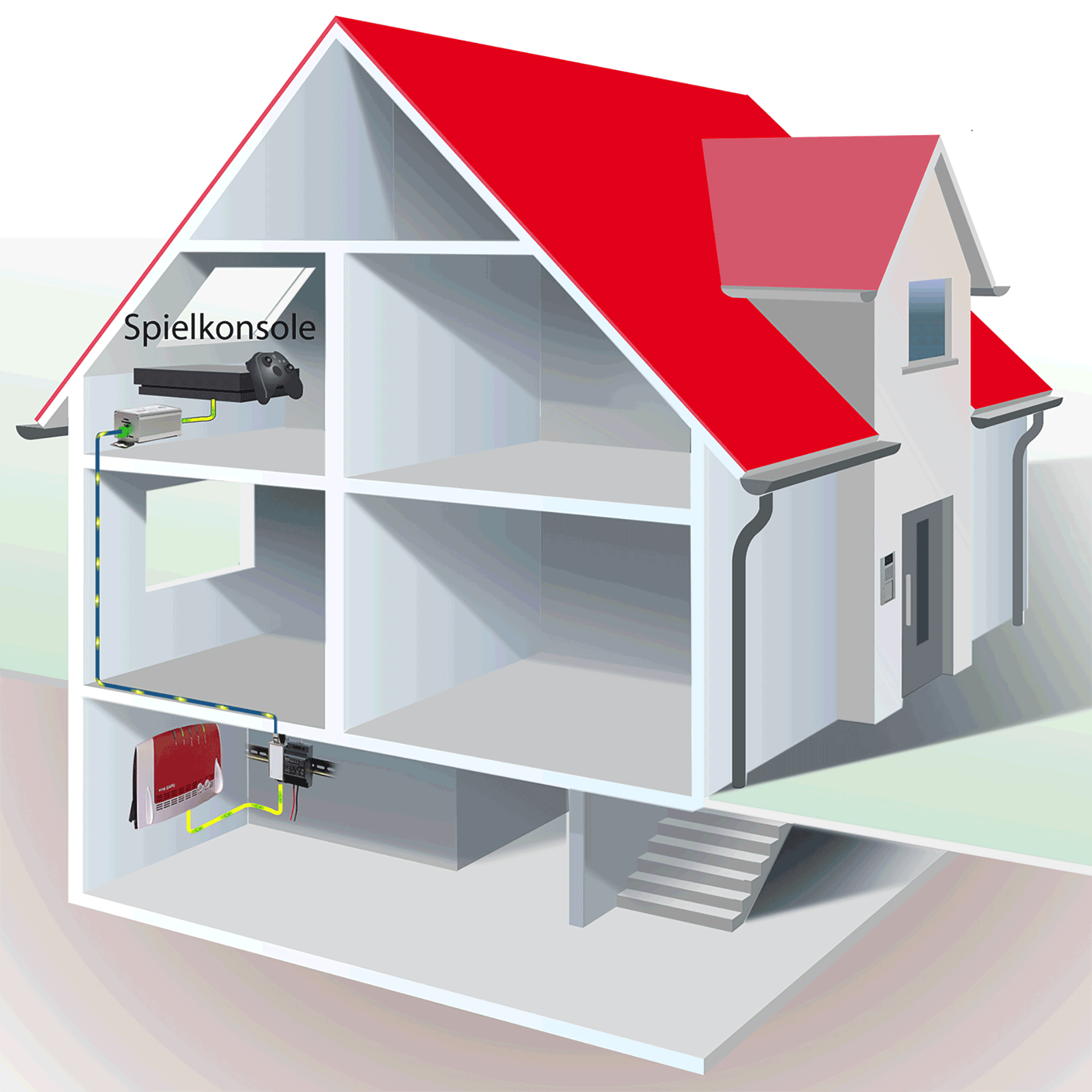Einsatz mit einer Spielkonsole. 1A Pingzeiten da kein WLAN. Das 2-Draht-LAN System löst das Problem