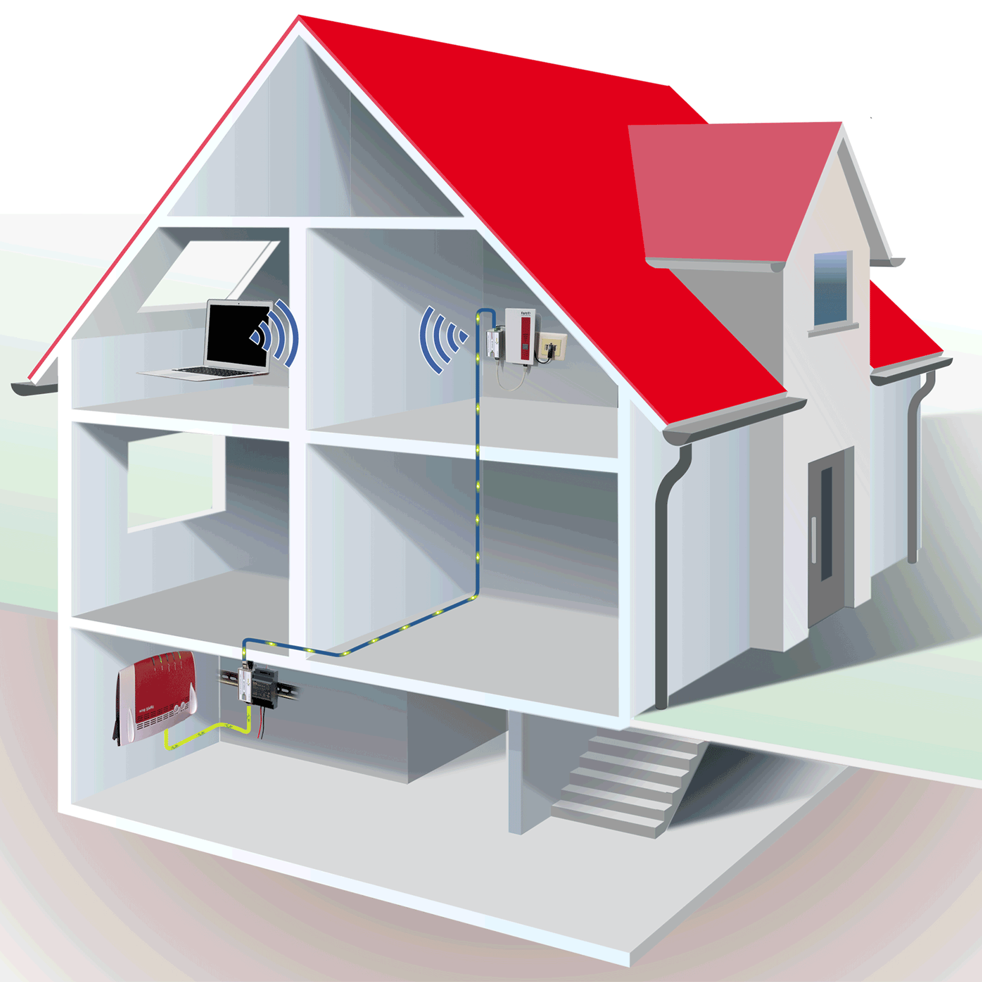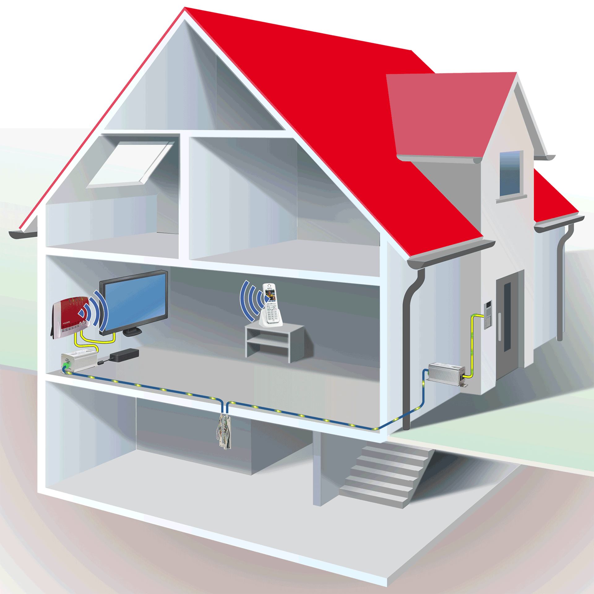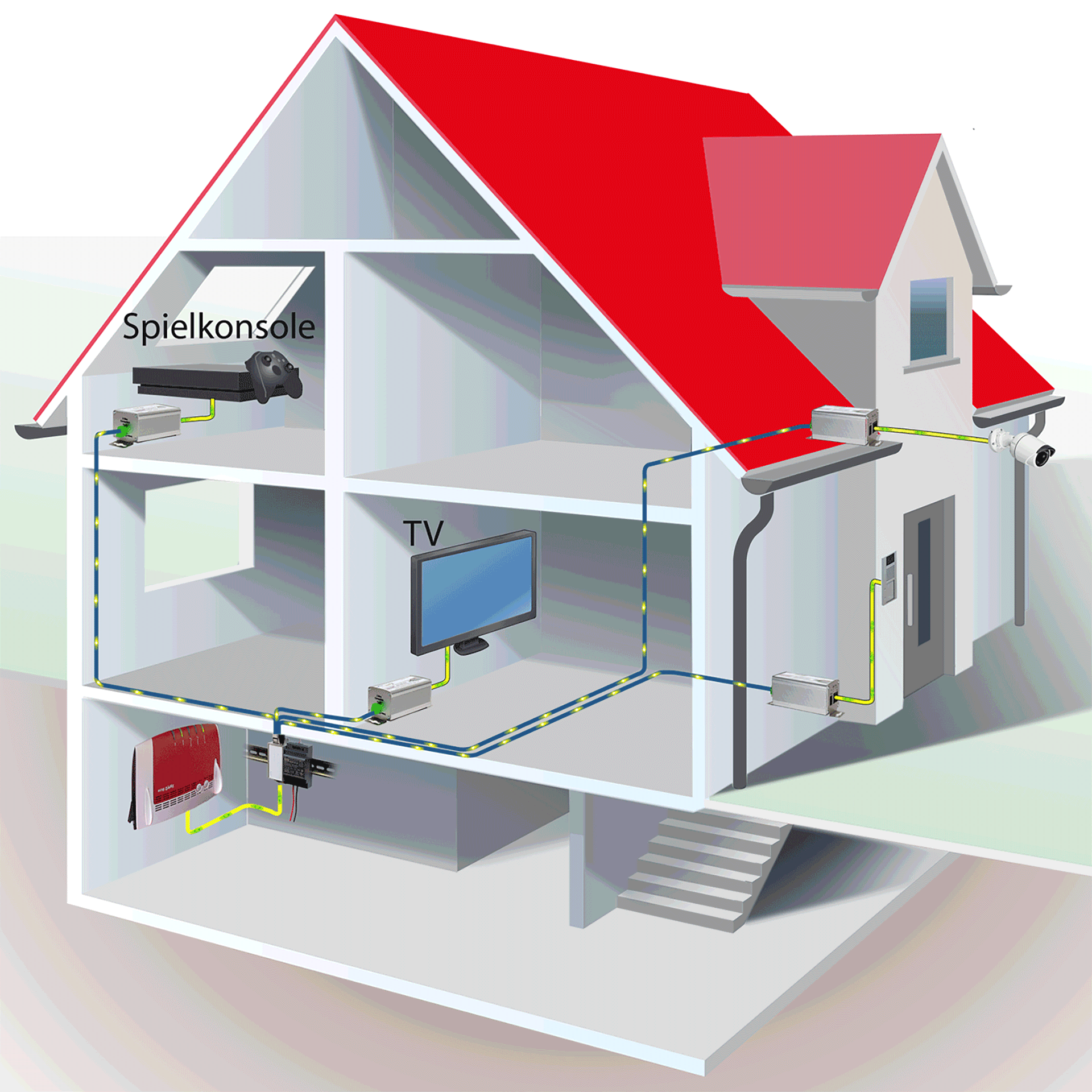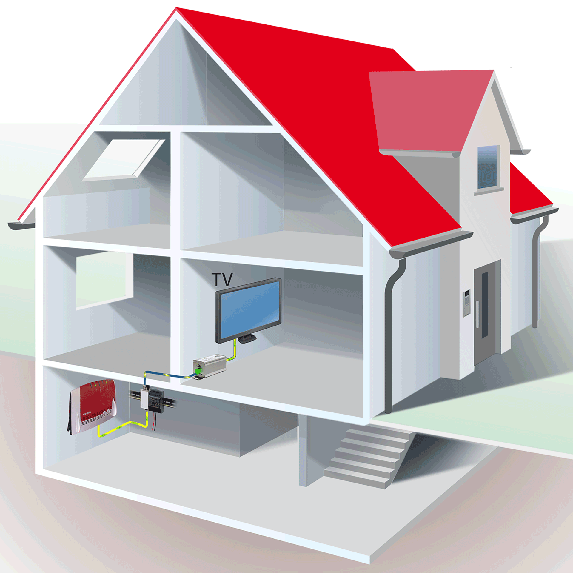 Einsatz mit einem TV Gerät. Kein Ruckeln beim Stream wegen schlechtem WLAN. Das 2-Draht-LAN System ist die Lösung