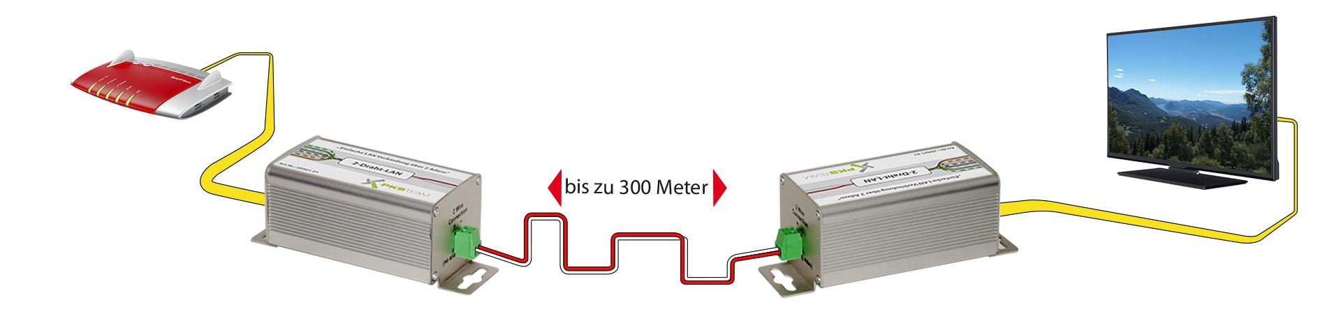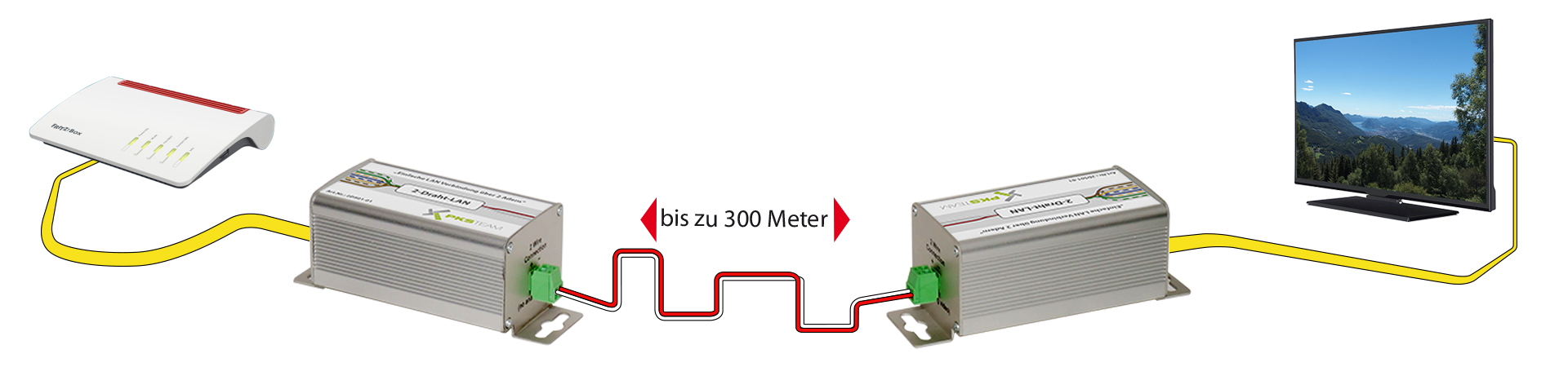Die Lösung: 2 existierende Adern einer Telefonleitung oder Antennenkabel nutzen und die Leistung mit dem 2-Draht-LAN System von der FRITZ!Box/Router zum TV bringen.