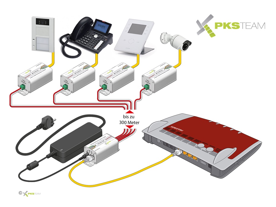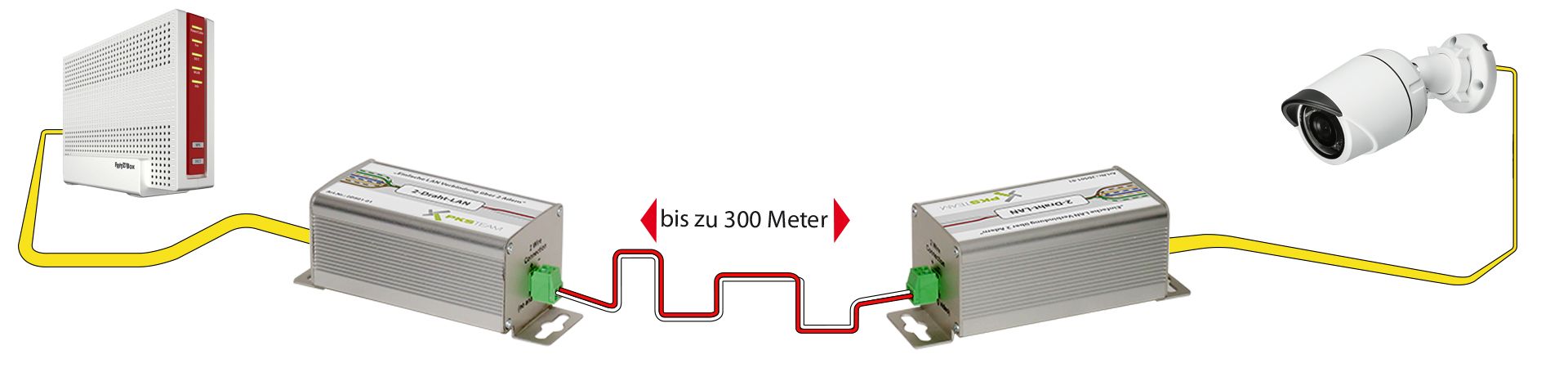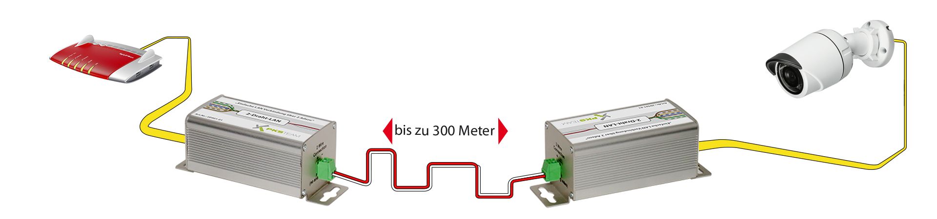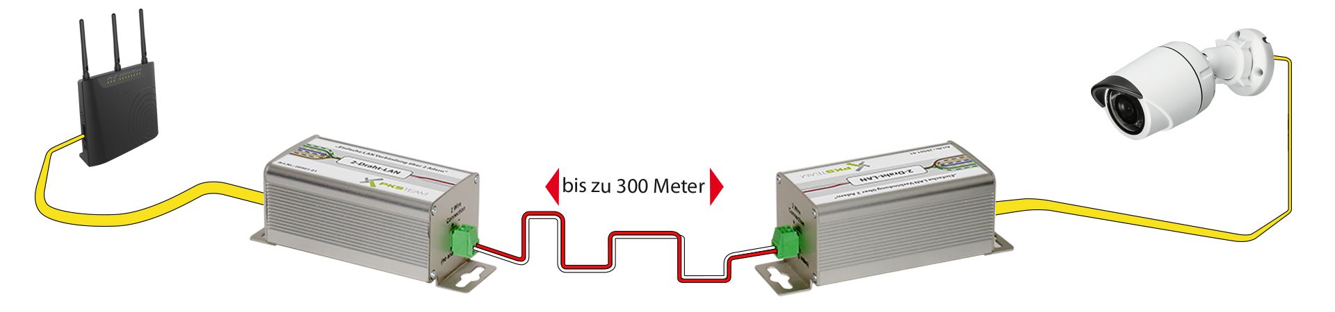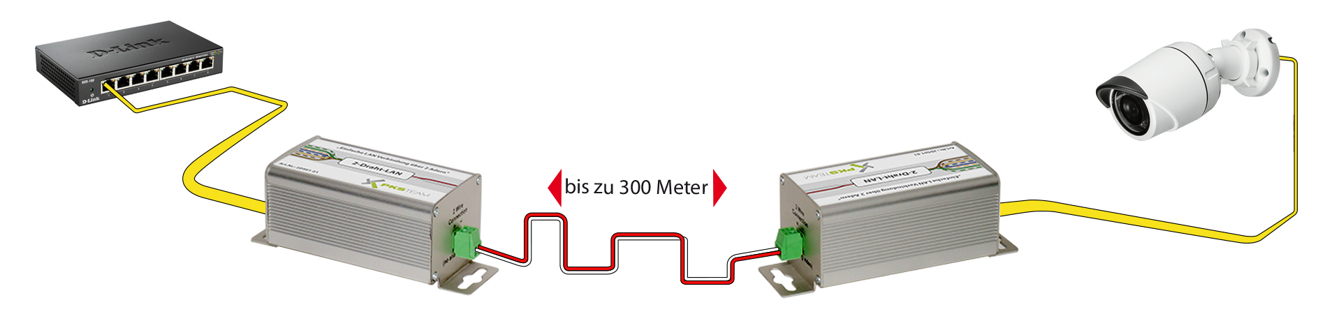 Nicht nur verwandelt das System Ihre 2 Adern in eine LAN Leitung: es liefert am Ziel auch der Norm entsprechenden Strom (PoE - Power Over Ethernet) um Ihre IP Kamera, IP Telefon, PoE Switch, IP Klingel oder andere PoE Geräte zu betreiben.