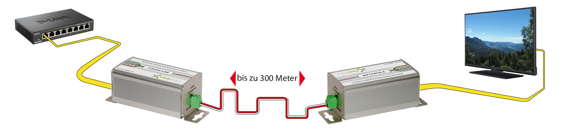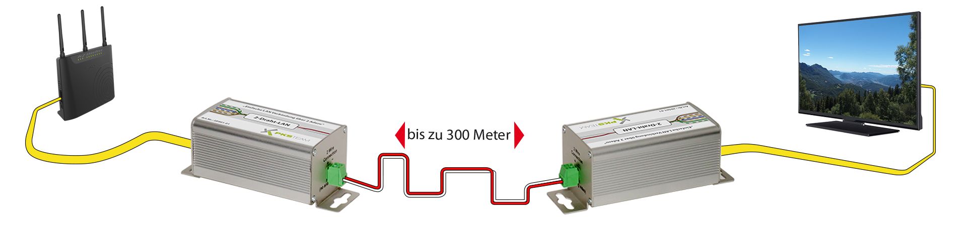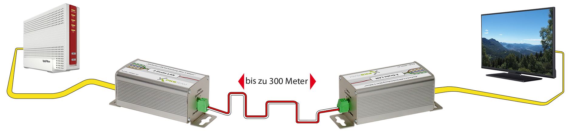 Die Lösung: 2 existierende Adern einer Telefonleitung oder Antennenkabel nutzen und die Leistung mit dem 2-Draht-LAN System von der FRITZ!Box/Router zum TV bringen.
